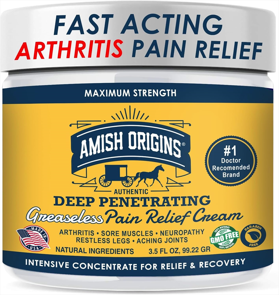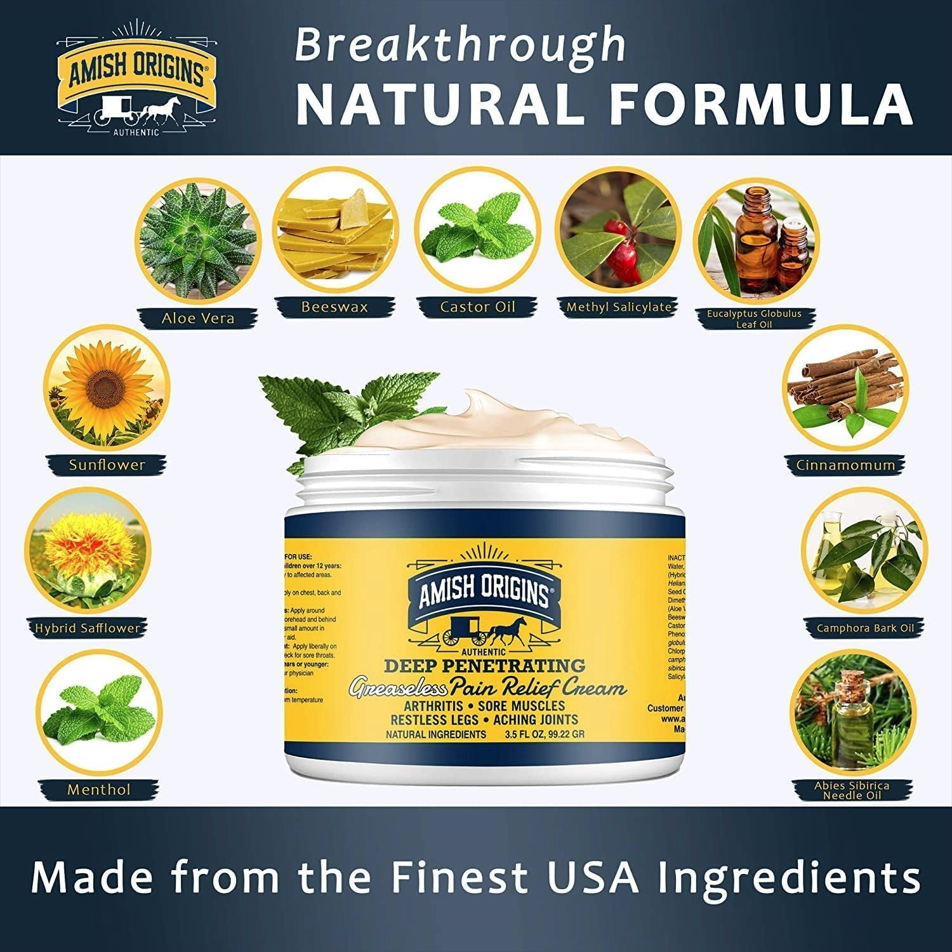 - Provides Fast Relief From Pain: Carefully Formulated With Active Ingredients That Target Pains, Amish Origins Deep Penetrating Pain Relief Cream Is Formulated To Provide Long-Lasting Relief From Pains Associated With Arthritis, Aching Joints, Sore Muscles, Restless Legs, Bruises, Sprains, Backache And More.