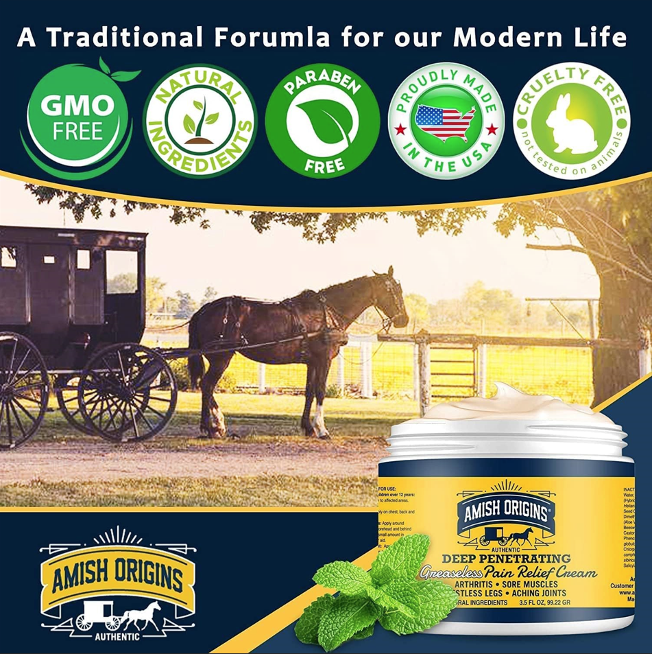 - Greaseless Formula: While Other Pain Relief Formula Leave Behind Annoying Greasy Residues After Application, Not Amish Origins. This Is Because Amish Origins Is Carefully Formulated To Deeply Penetrate The Skin Without The Greasy Feel.